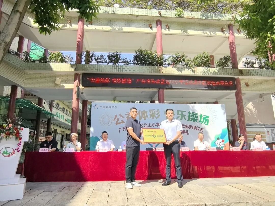 随后,广州市海珠区北山小学校长上台致辞。他表示,广州市体育彩票管理中心的爱心资助,使学校的操场条件得到提升,让孩子们得以拥有更广阔、更优质的运动空间,这份公益关怀为学校体育教育发展注入了强劲动力。