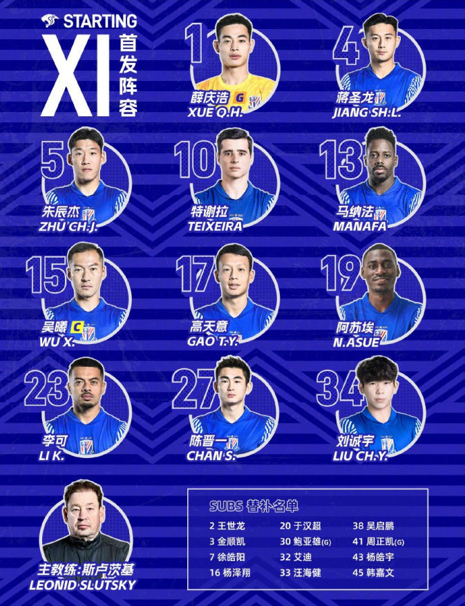 本场比赛双融优配,上海申花在首发上派出了1-薛庆浩、4-蒋圣龙、5-朱辰杰、13-马纳法、27-陈晋一、10-特谢拉、15-吴曦、17-高天意、23-李可、19-阿苏埃、34-刘诚宇的阵容。