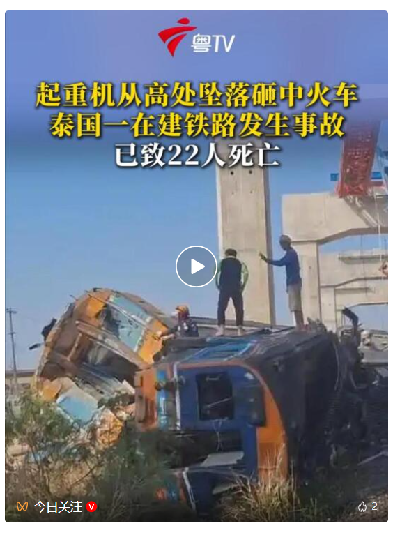 此前,据泰国媒体14日报道,当天发生在泰国呵叻府在建高铁项目的事故死亡人数升至22人,另有55人受伤。报道说,一台起重机在呵叻府高铁项目施工过程中坠落亿海智投,砸中一列行驶中的客运列车,导致车厢起火并脱轨。